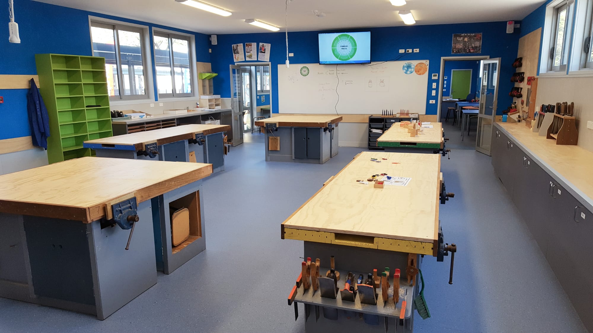 This project re-modelled existing technology specialist spaces – food technology, metalwork, wood-wood. Acoustic improvements were made in the food technology area. A large sun shading structure was included in the external courtyard to assist in creating an external space that the students are pleased to use.